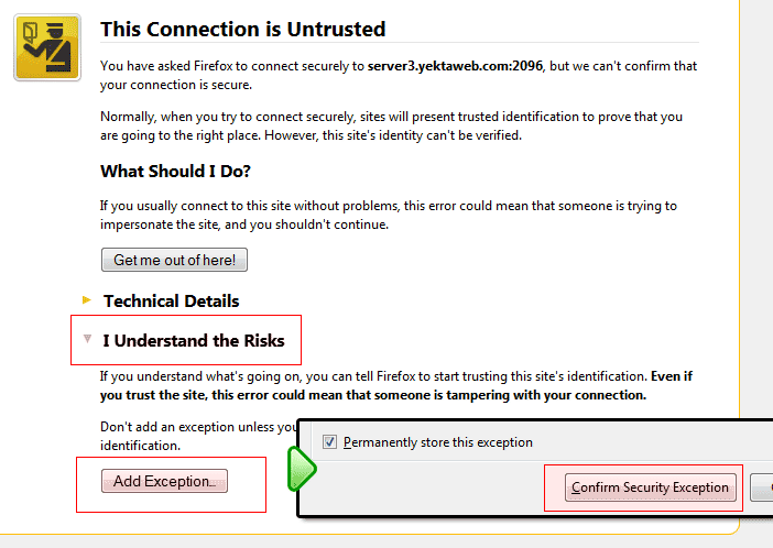 اگر هنگام مشاهده نشانی های وب میل و سی پانل با اخطار مرورگر مواجه شدید، با کلیک روی مواردی که در تصاویر زیر مشخص هستند، آن را تایید کنید.